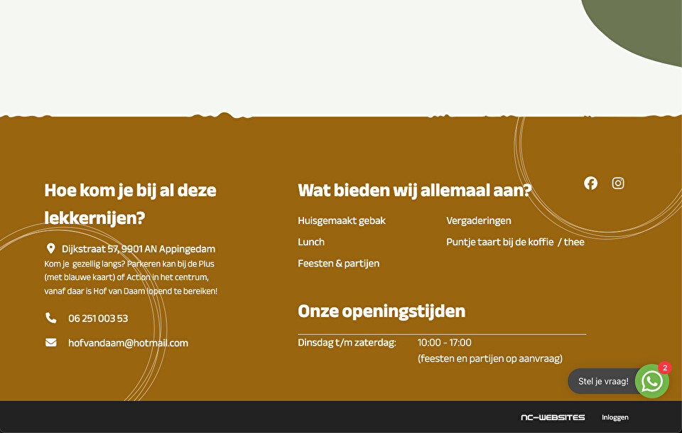 CSSfooter.nav-footer .top { background-color: var(--primary); color: white; padding: 2.5rem 0; } @media only screen and (min-width: 992px) { footer.nav-footer .top { padding: 5rem 0; } } footer .footer-socials a { margin: 0 0.5rem 1rem 0; font-size: 1.25em; transition: 0.4s color; color: white; } footer.nav-footer .title { font-size: 2.25rem; font-weight: 700; font-family: var(--font-family-heading); color:var(--primary); } footer.nav-footer .top a, footer.nav-footer .bottom a.nav-link { color: white; } footer.nav-footer .footer-socials a:hover, footer.nav-footer .footer-socials a:focus, footer.nav-footer .top a:hover, footer.nav-footer .top a:focus { color: var(--secondary); } footer.nav-footer ul { column-count: 2; } footer.nav-footer .opening_times-day_of_week { color: var(--secondary); } footer.nav-footer .opening_times-overview { columns: 2; column-gap: 30px; padding-inline-start: 0px; border-top: 1px solid white; padding-top: 0.5rem; } footer.nav-footer .opening_times-overview li { display: flex; justify-content: space-between; margin-bottom: 0.5rem; } footer.nav-footer ul li a { padding-left: 0; } footer.nav-footer .bottom { background-color: var(--secondary); color: white; } footer.nav-footer .bottom a.nav-link:hover, footer.nav-footer .bottom a.nav-link:focus { background-color: white; color: var(--primary); }