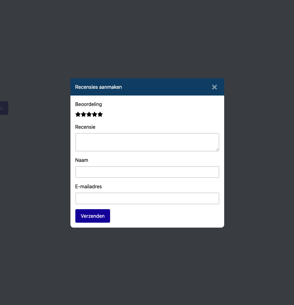 HTML<!-- Knop voor openen modal --> <button type="button" class="btn btn-primary" onclick="window.modalShow.createFromElement(document.getElementById('review-form'), { title: ' Recensies aanmaken' })"> Recensies aanmaken </button> <!-- Review formulier --> <div class="d-none"> <div id="review-form"> <nc-review-form name="reviews"></nc-review-form> </div> </div>