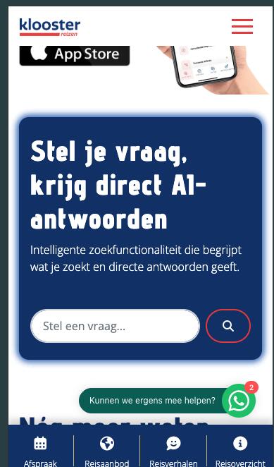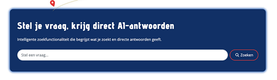 HTML<div class="search-section"> <div class="container"> <div class="search-bar"> <nc-element page="1" name="search-bar-title" default="Stel je vraag, krijg direct AI-antwoorden" type="h2"></nc-element> <nc-text page="1" name="search-bar-intro" default="<p>Intelligente zoekfunctionaliteit die begrijpt wat je zoekt en directe antwoorden geeft.</p>"></nc-text> <div class="py-3"></div> <nc-search-bar name="search-bar-footer" page="1" placeholder="Stel een vraag..."></nc-search-bar> </div> </div> </div>