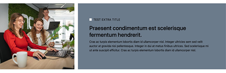 V000-19Deze preset toont een afbeelding links voor 33% met een tekstblok er rechts naast voor 66%. De afbeedling wordt uitgerekt tot de rand van het scherm. De tekst blijft altijd binnen de randen van de bootstrap container.