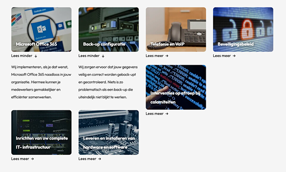 V000-23Geef contentblokken met een afbeeldingen, een titel en een uitklapbare tekst weer. Ideaal om grote hoeveelheden content netjes op een website te zetten.