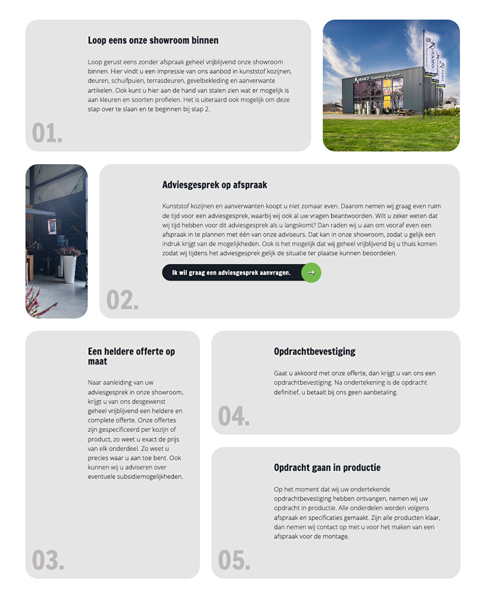 V000-13Geef een stappenplan weer als opgedeelde panelen, waar tussendoor ook nog afbeeldingen weergegeven kunnen worden. De layout wordt automatisch zo goed mogelijk weggezet. Standaard is er ondersteuning tot 8 panelen. Op mobiel zullen de stappen onder elkaar gezet worden. Hou er bij het uitsnijden van een eventuele afbeelding rekening mee dat hoe de afbeelding uitgesneden wordt ook exact in het stappenplan komt te staan.