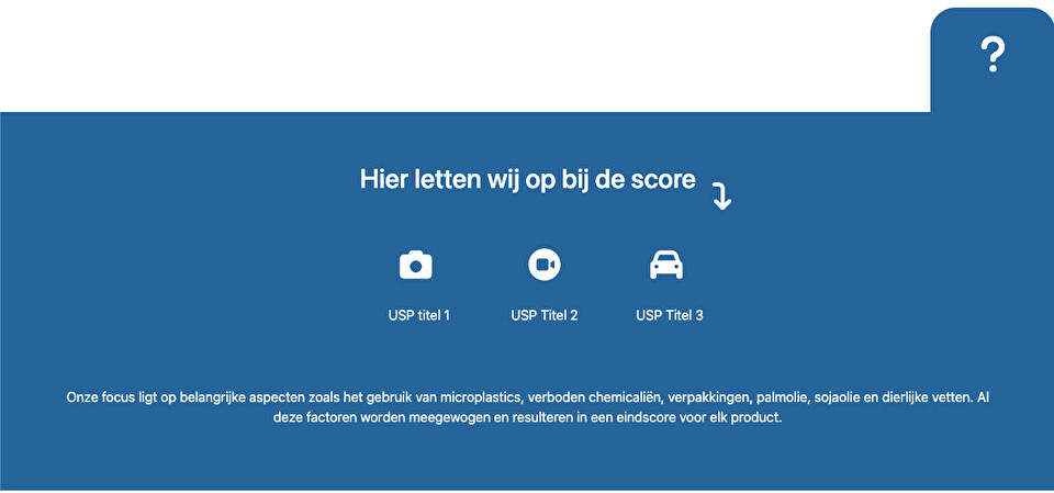 HTML<section class="usp-bar-tab text-center"> <div class="container"> <nc-element name="usb-bar-tab-title" type="h2" attributes="class=after-arrow" default="Hier letten wij op bij de score"></nc-element> <nc-preset-list type="ul" attributes="class=icons" name="usb-bar-tab-title"> <li> <nc-element name="{%name%}-icon" attributes="class=icon" type="p"></nc-element> <nc-element name="{%name%}-caption" attributes="class=icon-caption" type="p"></nc-element> </li> </nc-preset-list> <div class="py-4"></div> <nc-text name="usb-bar-tab-text"></nc-text> </div> </section>