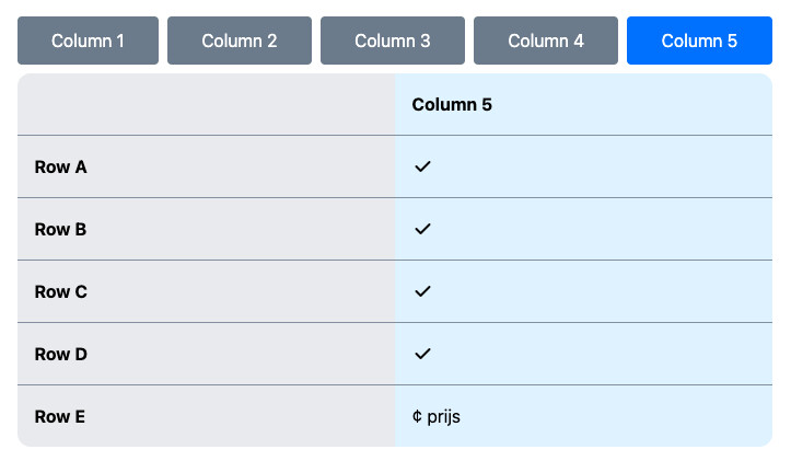 V000-38Maak van een normale beheerbare tabel een vergelijkingstabel dat ook op mobiel gemakkelijk te gebruiken is. Er zullen automatisch knoppen boven de table komen te staan waarmee de bezoeker een kolom kan selecteren om weer te geven. Op mobiel zal standaard de laatste kolom als eerste zichtbaar zijn en deze wordt ook extra met de opmaak uitgelicht.