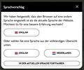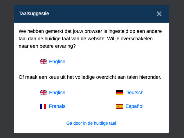 Deze taalkeuze mogelijheid laat een pop-up zien als de taal waarop de bezoeker de website bezoekt niet de taal van de browser is. Mocht de taal die de browser heeft wel voorkomen in de website dan wordt deze pop-up getoont om de gebruiker daar naar toe te leiden. Het resultaat wordt in de cookies opgeslagen dus de gebruiker zal niet steeds gevraagt worden om een keus te maken nadat ze de modal hebben gesloten.