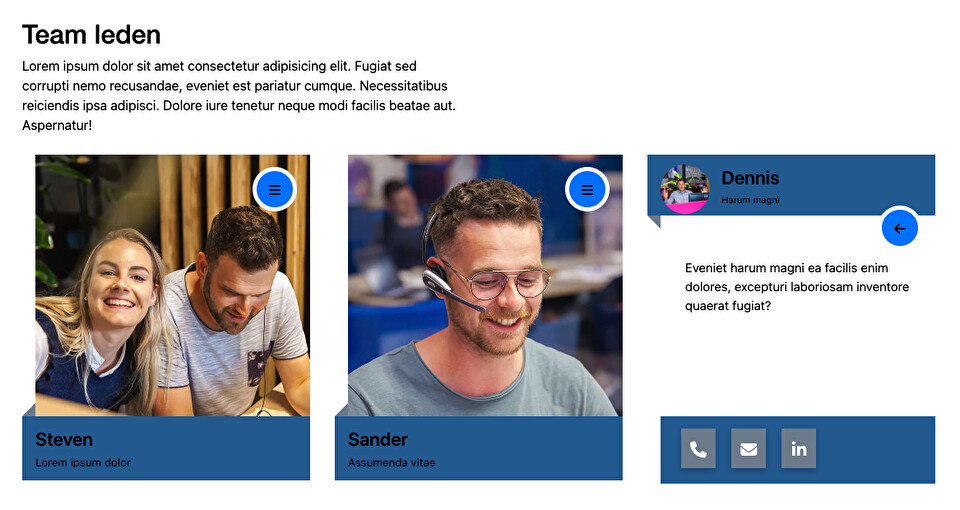 HTML<div class="container"> <div class="row"> <div class="col-12 col-sm-9 col-md-6"> <nc-text name="team"></nc-text> </div> </div> <div class="py-3"></div> <nc-preset-list name="teams" attributes="class=team-members" columns="3"> <div data-name="{%name%}" class="team-member-panel"> <div class="title"> <nc-element type="span" name="{%name%}-name" page="{%page%}" default="Uw naam"></nc-element> <nc-element type="strong" name="{%name%}-position" page="{%page%}" default="Uw functie"></nc-element> </div> <div class="team-member-content"> <div class="team-member-image"> <nc-image name="{%name%}-image" page="{%page%}" alt-attributes="class=img-fluid" width="640" height="640"></nc-image> </div> <div class="team-member-description"> <nc-text name="{%name%}-description" page="{%page%}" default="Uw quote"></nc-text> </div> </div> <button type="button" class="team-member-button"> <?= NCCMS::getView('cms/icon', 'fa-bars') ?> </button> <div class="team-member-footer"> <ul> <li data-editor-field="tel"> <a href="tel:"> <?= NCCMS::getView('cms/icon', 'phone') ?> </a> </li> <li data-editor-field="mailto"> <a href="mailto:"> <?= NCCMS::getView('cms/icon', 'envelope') ?> </a> </li> <li data-editor-field="linkedin"> <a href="" target="_blank"> <?= NCCMS::getView('cms/icon', 'fa-brands fa-linkedin-in') ?> </a> </li> </ul> <div class="editor-mode-content-only"> <nc-element type="span" name="{%name%}-tel" attributes="class={%name%}-tel" page="{%page%}" default="Uw telefoonnummer"></nc-element> <nc-element type="span" name="{%name%}-mailto" attributes="class={%name%}-mailto" page="{%page%}" default="Uw e-mailadres"></nc-element> <nc-element type="span" name="{%name%}-linkedin" attributes="class={%name%}-linkedin" page="{%page%}" default="Uw LinkedIn link"></nc-element> </div> </div> </div> </nc-preset-list> </div>